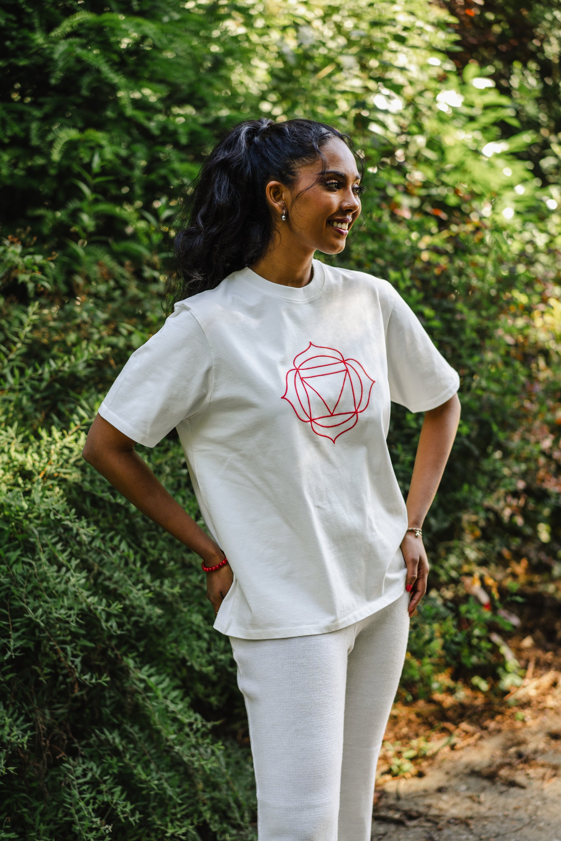 Symbole Chakra Racine rouge brodé en fils de Tencel biodégradable milieu devant.